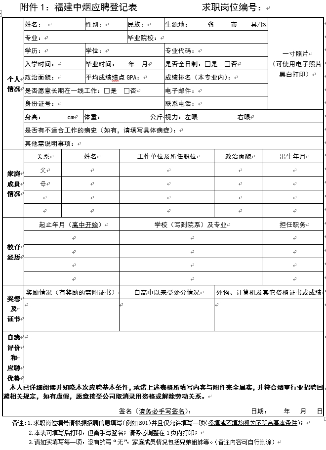 1.【必须】word版《福建中烟应聘登记表》(附件1,或福建中烟官网https://www.fjtic.com.cn/人才招聘模块下载);