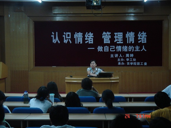 5月24日下午7点30,由365WM完美体育团工委组织承办的大学生素质报告会在7号教学楼2层报告厅举行。周婷老师以“认识情绪,管理情绪——做自己情绪的主人”为中心,就现在大学生所出现的一些不良情绪及心理问题,经过长时间的思考及总结,向大家做了一场深刻的报告。