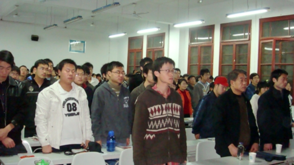 庄严的国歌之后,赵普庆">赵普庆老师做动员讲话。赵普庆">赵老师首先代表学院党委对本期培训班的顺利开课表示热烈祝贺;接着又强调了此次培训的目的,即“让更多同学有机会参加党的理论知识的学习和培训,为培养一批既具有真才实学,又具有坚定共产主义信念的社会主义建设者和接班人提供了一个平台”。这充分体现了“学校、学院党组织和各级领导对青年学生成长的关心”。赵老师还以一名老党员的身份,向学员们提出两点殷切的希望:一按时参加学习——包括准时参加活动,认真听讲记笔记,认真参加讨论,真正全面掌握党的理论知识;端正入学动机,树立正确的世界观、人生观、价值观;努力学好科学文化知识,严格遵守校规校纪,加强思想道德修养,以实际行动争取早日加入党组织;二努力向党组织靠拢——学员们在日常生活中要关心时政,深入学习和实践十七大精神,贯彻落实科学发展观,解放思想,与时俱进,关心时事,牢固树立社会主义荣辱观,切实提高自己的思想觉悟;通过学习,要对照新时期共产党员的标准和要求,找到自身的不足,全面提高自身素质,以实际行动向党组织靠拢。最后他鼓励学员们抓住历史机遇,在党的教导下找到自身发展的方向和坐标,坚定马克思主义追求,在各班及学院建设中发挥先锋模范作用,并衷心祝愿全体学员学习进步,祝愿本期培训圆满成功。