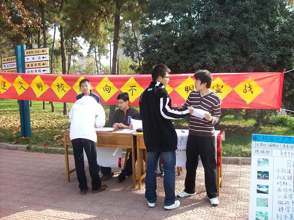 2006年11月11日,365WM完美体育在北校区南门口举办了“校园十大不文明行为”评选活动。旨在弘扬中华传统美德,响应学校创建文明校园号召,使全体学生发扬主人翁意识,勇于承担起责任,规范自己的言行,在反思中感悟,在感悟中自醒,在自醒中找到真善美。