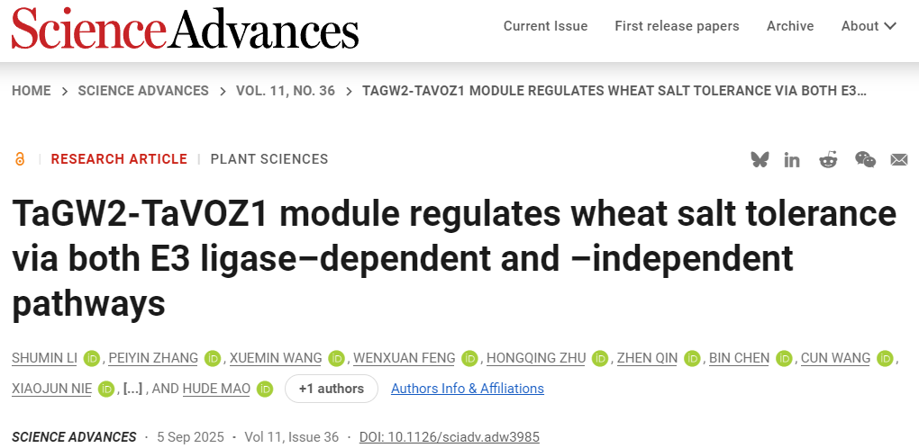近日,西北农林科技大学作物抗逆与高效生产国家重点实验室康振生院士/毛虎德研究员课题组在Science Advances杂志发表了题为“TaGW2-TaVOZ1 module regulates wheat salt tolerance via both E3 ligase-dependent and -independent pathways”的研究论文,首次揭示了TaGW2的双重功能,即兼具E3泛素连接酶和转录抑制因子活性,阐明了TaGW2-TaVOZ1模块通过“泛素化降解”与“转录竞争”两种机制共同调控小麦耐盐性的分子机制,突破了此前对E3连接酶功能的单一认识,为耐盐高产小麦新品种培育提供了重要理论依据和基因资源。