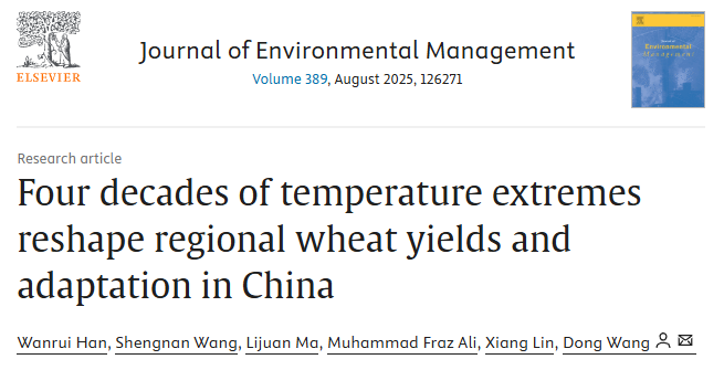 近日,365WM完美体育王东教授团队在国际期刊《Journal of Environmental Management》发表题为“Four decades of temperature extremes reshape regional wheat yields and adaptation in China”研究论文。我院2022级博士生韩婉瑞为论文第一作者,王东教授为论文通讯作者。