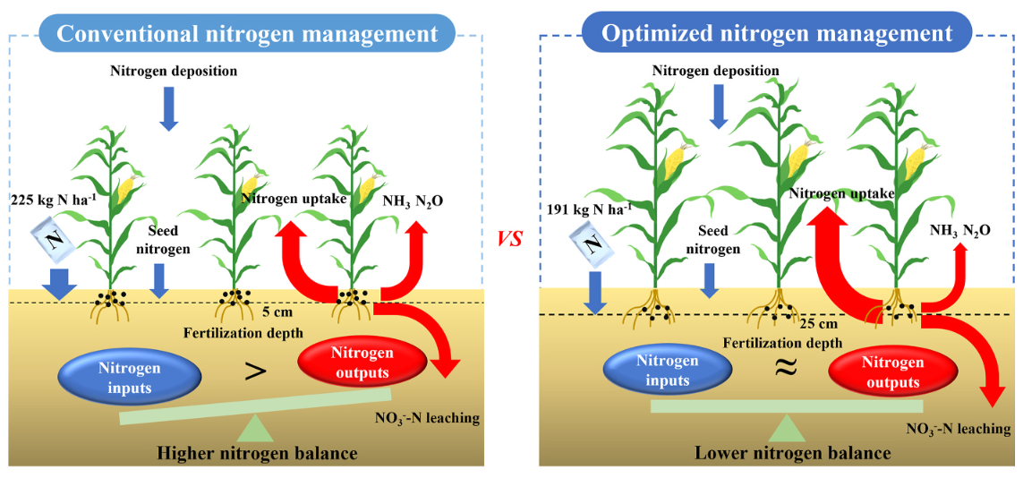 优化氮肥管理对改善农田氮素平衡、促进农业可持续发展具有关键作用。在各项措施中,氮肥深施配合减量施用是提高氮肥利用效率、优化氮平衡的重要途径之一。本研究聚焦干旱半干旱区玉米氮肥管理优化问题,基于农田氮素循环的系统评估,综合分析了氮肥施用量与施肥深度对旱地玉米产量、氮素吸收、氨挥发、氧化亚氮排放、硝态氮淋失以及土壤氮素留存的影响。研究结果表明,相较于传统浅施方式,优化氮肥管理在提高玉米氮素吸收量和籽粒产量的同时,显著降低了氨挥发和氧化亚氮排放,并减少了土壤硝态氮残留与淋失风险。在氮肥减量深施条件下,土壤总氮含量与肥力得以有效维持,氮素盈余量与表观氮平衡值也显著下降。优化管理还表现出明显的协同效应,显著提升了净经济效益。进一步分析发现,在降雨较多年份,协同优化施肥深度与用量能有效抑制硝态氮向深层土壤迁移,这凸显了在旱区建立降雨适应性施肥新方式的重要意义。上述结果对制定区域性氮肥管理策略具有重要指导价值,建议在实践中综合考虑降雨特征、土壤特性与作物根系分布等关键因素,以实现农业增产与环境可持续的协同发展。