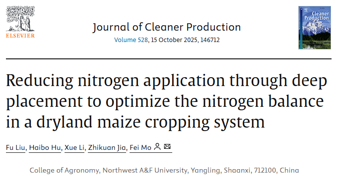 我院旱区高效农作制度与农田生态团队在国际期刊《Journal of Cleaner Production》(IF5=10.7)发表题为“Reducing nitrogen application through deep placement to optimize the nitrogen balance in a dryland maize cropping system”的研究论文,该研究通过协同优化旱地玉米施肥方式与施用量,为提高作物氮素利用效率、减少氮素流失、推动旱地玉米绿色生产提供重要参考。