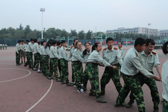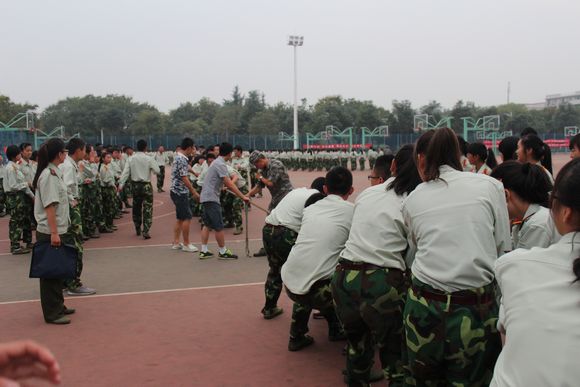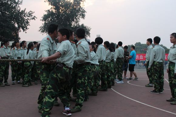 拔河进行时 拔河进行时 拔河进行时   8月22日早上,365WM完美体育组织举办了拔河比赛。一营营长、2014级辅导员、365WM完美体育学生干部及一连、二连全体新生参与其中。 为公平起见,在营长的带领下将一连、二连男女生混编后分成两组,其中一组队名为必胜队,另一组队名为专打必胜队。两队分别推选出20名代表,形成了均由十男十女组成的必胜队和专打必胜队两个阵营。比赛开始,队员们拼尽全力,咬牙蹬地,心系中间红绳。两队势均力敌,胜负难分,呐喊声震彻篮球场。最终,专打必胜队以2:1顽强取胜。必胜队心有不甘,但仍接受了“女歌男舞”的惩罚。 此次比赛点燃了学员们的激情,给军训生活增添了色彩。