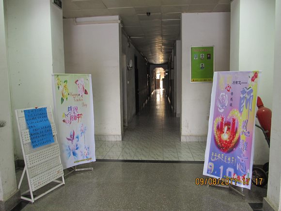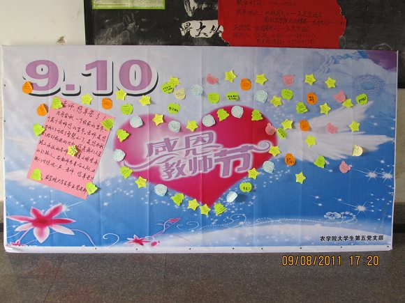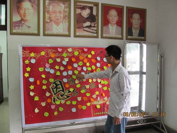 9月8日下午,带着学子们对老师们的真诚祝福,怀着无比激动的心情来制作这一快快用心交织起来的图案。抬木板,找支架,贴祝福……党支部的每个成员都为能对老师表达自己的感激之情而特别高兴。天气晴朗,阳光照在汗水上仿佛也兴奋的闪着晶亮亮的光彩。同学们认真地发挥创意,细心地铺、贴、粘、摆,把自己想要送给老师的祝福写在爱心纸条上放在在院办、实验楼等多处公开场合,以宣传板以及横幅的形式表达自己对老师最诚挚的祝福与感谢。