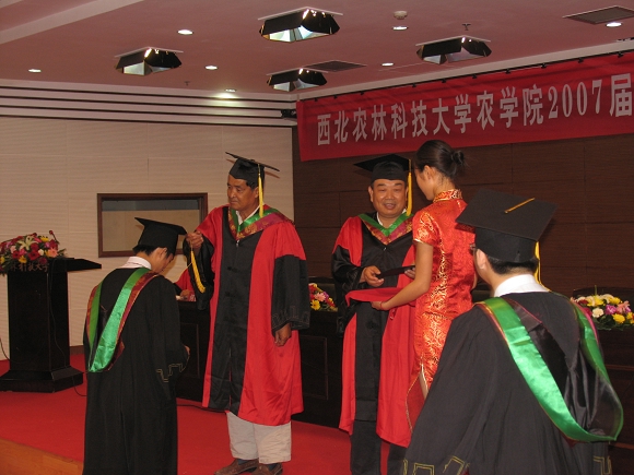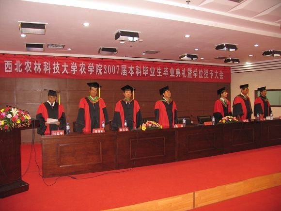 6月26日15:00,我院在国际合作交流中心208会议室隆重举行了2007届本科毕业生毕业典礼暨学位授予大会。188名获得农学学士学位的毕业生身着学士服,满怀喜悦的心情参加了这一庄严的盛会。 校党委副书记马书尚教授、陕西省教学名师、博士生导师何蓓如教授、博士生导师王辉教授以及全体院领导出席了大会, 大会由杜世平副院长主持。