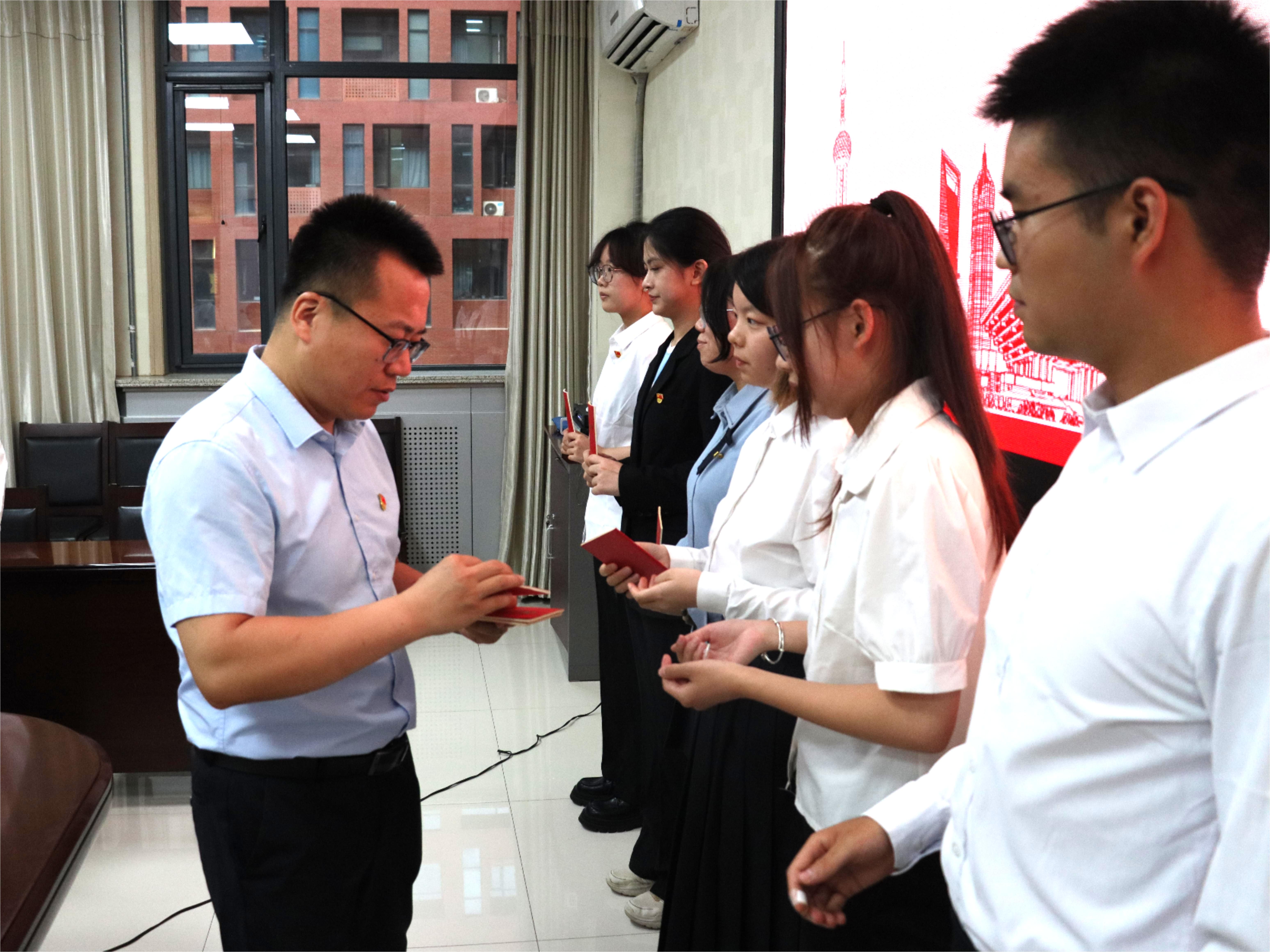 誓言铿锵铭初心,党徽闪耀启新程。为迎接中国共产党成立104周年,强化党员身份意识,筑牢理想信念根基,6月29日,大学生第四党支部在学院203会议室隆重举行新发展党员入党宣誓仪式。学校党委校长办公室副主任王军、学院团委副书记黄宾及全体党员参加仪式,共同见证7名新党员政治生命的光辉起点。