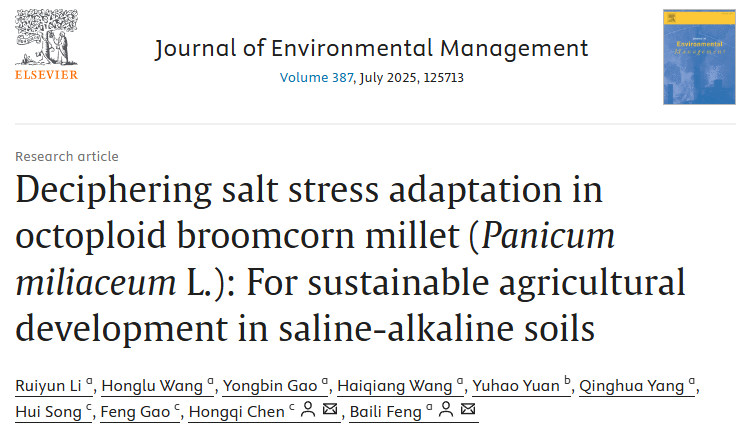 近日,365WM完美体育特色杂粮科技创新团队在国际期刊《JOURNAL OF ENVIRONMENTAL MANAGEMENT》发表题为Deciphering salt stress adaptation in octoploid broomcorn millet (Panicum miliaceum L.): For sustainable agricultural development in saline-alkaline soils研究论文。我院2022级硕士生李瑞云为论文第一作者,冯佰利教授为论文通讯作者。